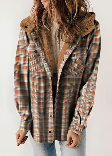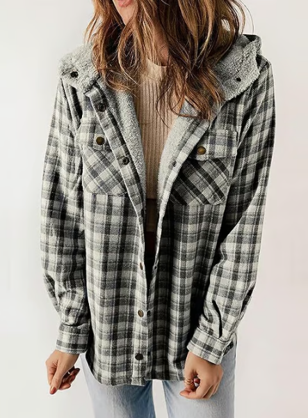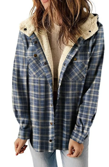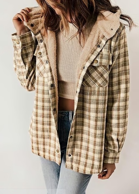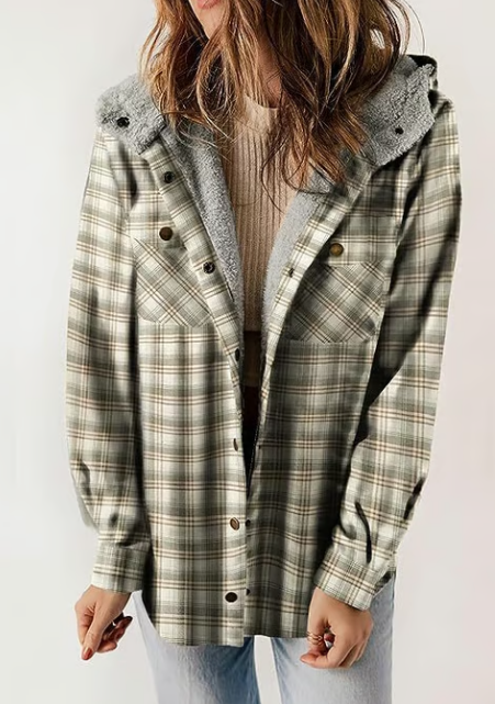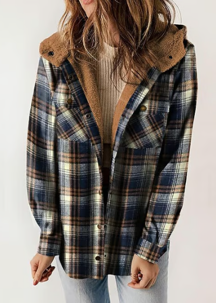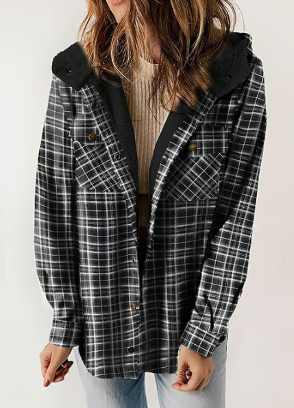Damebukse i rutete stoff for høst/vinter, langermet jakke med spenne og hette, varm frakk