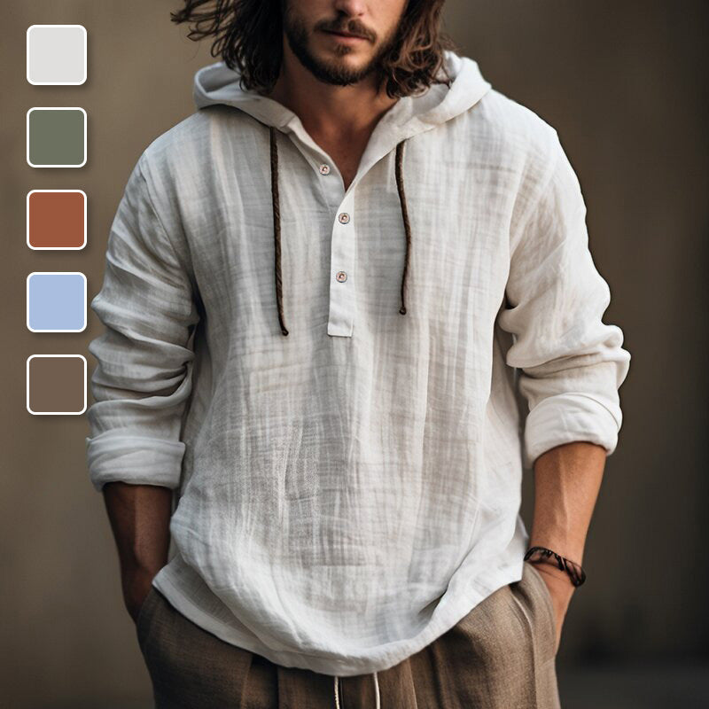 Pustende, ensfarget hettegenser med knapp foran i bomull og lin for menn