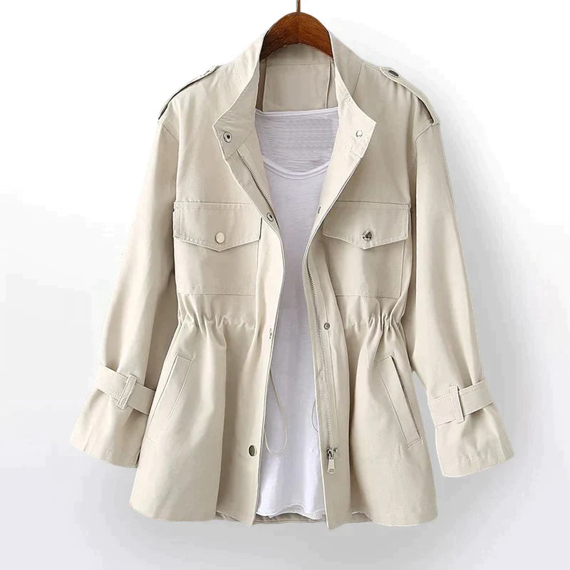 Den innskårne midjen og den elegante reverskraven gir et feminint preg og tilfører et ekstra lag finesse uten å tynge deg ned.