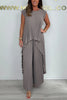 Sett med plissert kortermet, uregelmessig miditopp og bukser med vide ben og strikk i livet