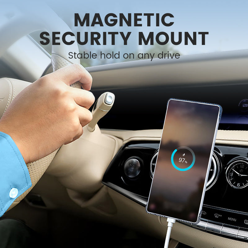 MAGNETISK SIKKERHET: Opplev uovertruffen stabilitet når du er på farten. Våre integrerte høystyrkemagneter låses sikkert fast på ethvert magnetisk bilfeste, noe som gjør selv den mest humpete pendling eller biltur til en problemfri tur. Naviger trygt og lad trådløst.