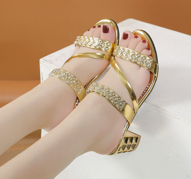 Pakken inneholder: 1* Damesandal med blokkhæl og utsmykning av rhinestone