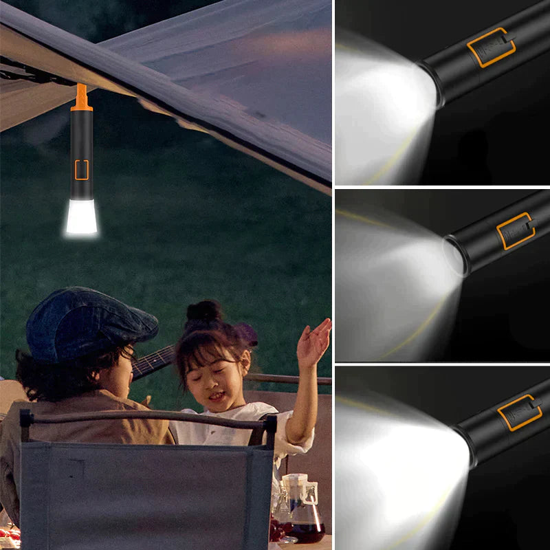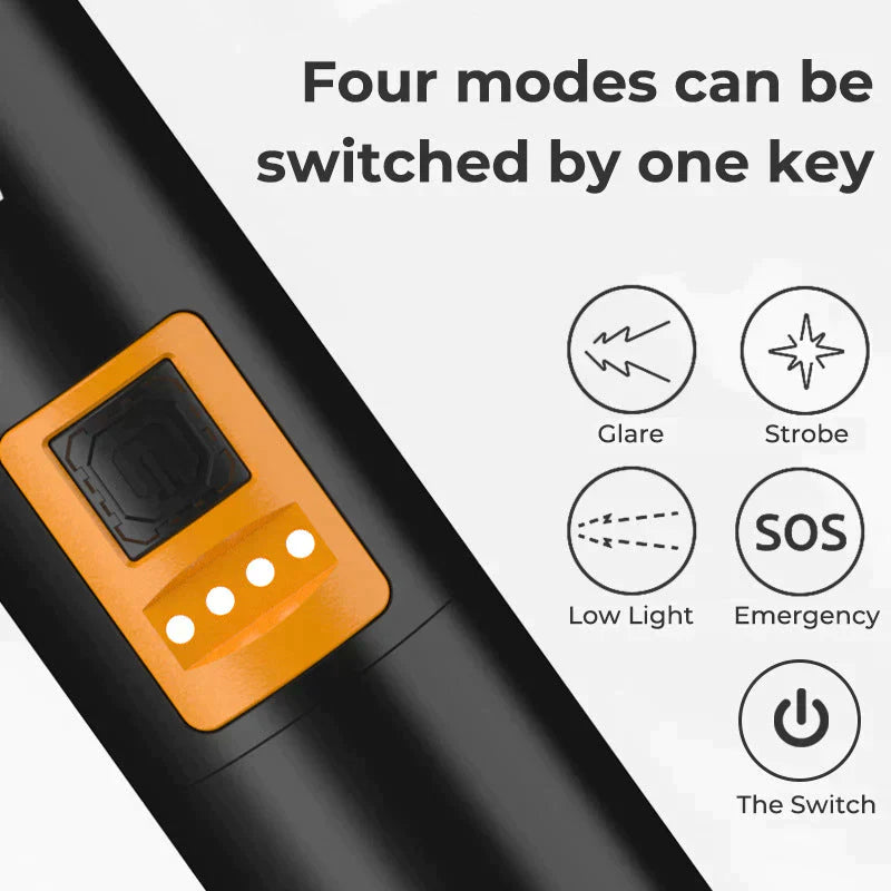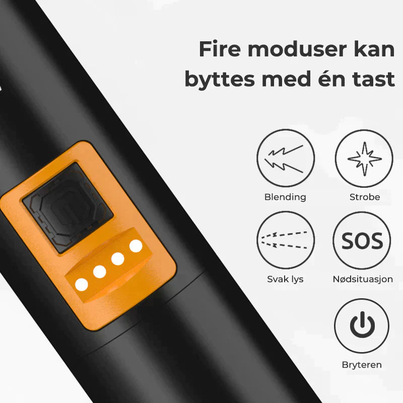 【3 moduser】 Trykk på knappen for å slå på lommelykten. Av/på-knappen har 3 moduser: lite lys - sterkt lys som blinker - supersterkt, som kan møte dine forskjellige belysningskrav.