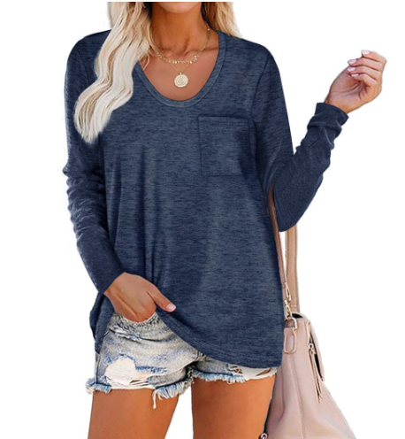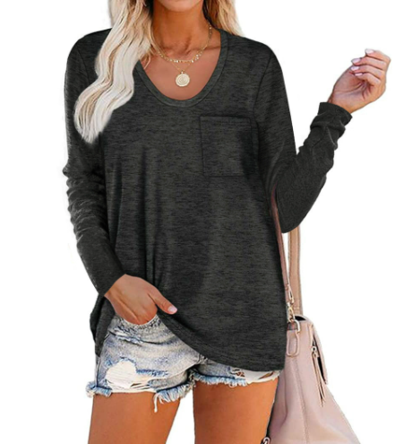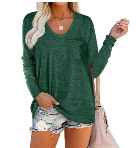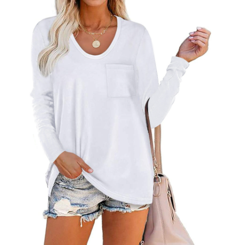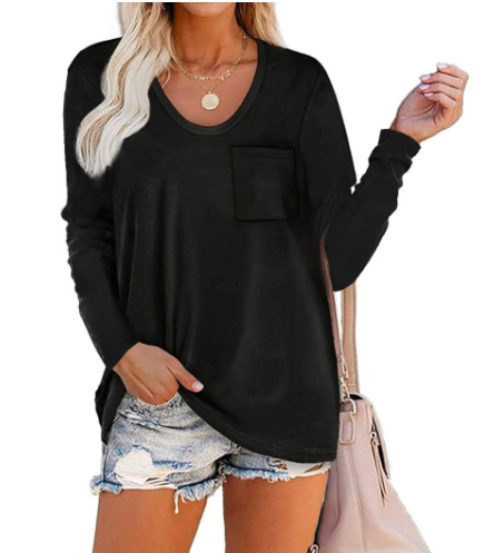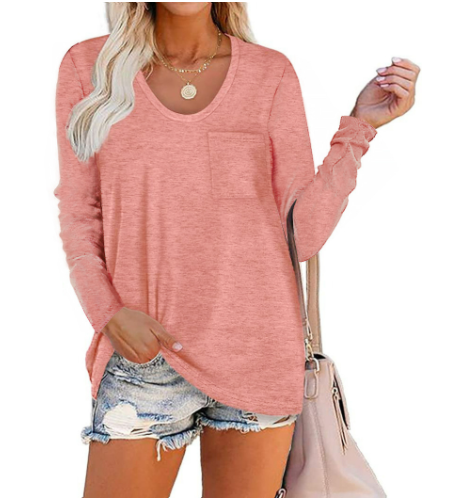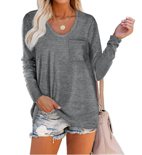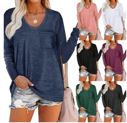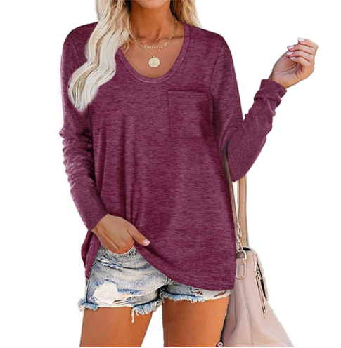 Ensfarget t-skjorte med lang erme og rund hals og lomme