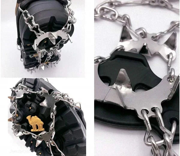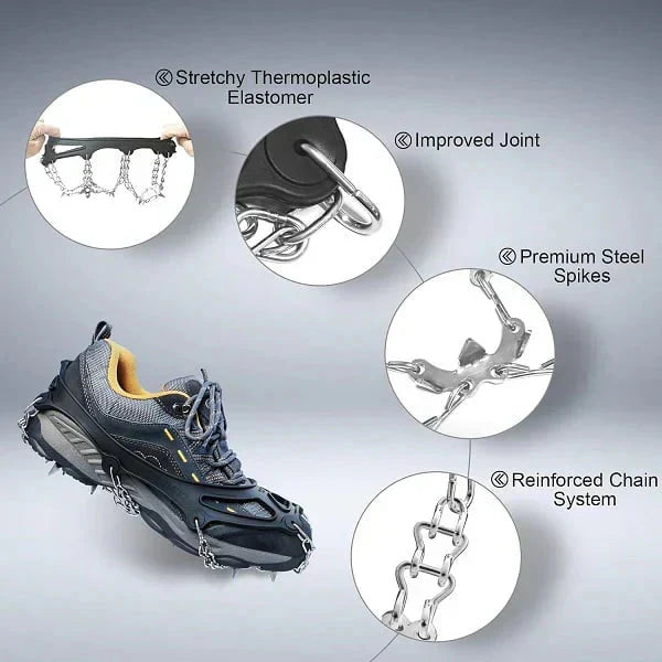 Våre oppgraderte Non-Slip Grip Spikes forhindrer at du sklir og skader deg når du går på snø eller is, og de er mye brukt av løpere, turgåere, turgåere og vinteridrettsutøvere.