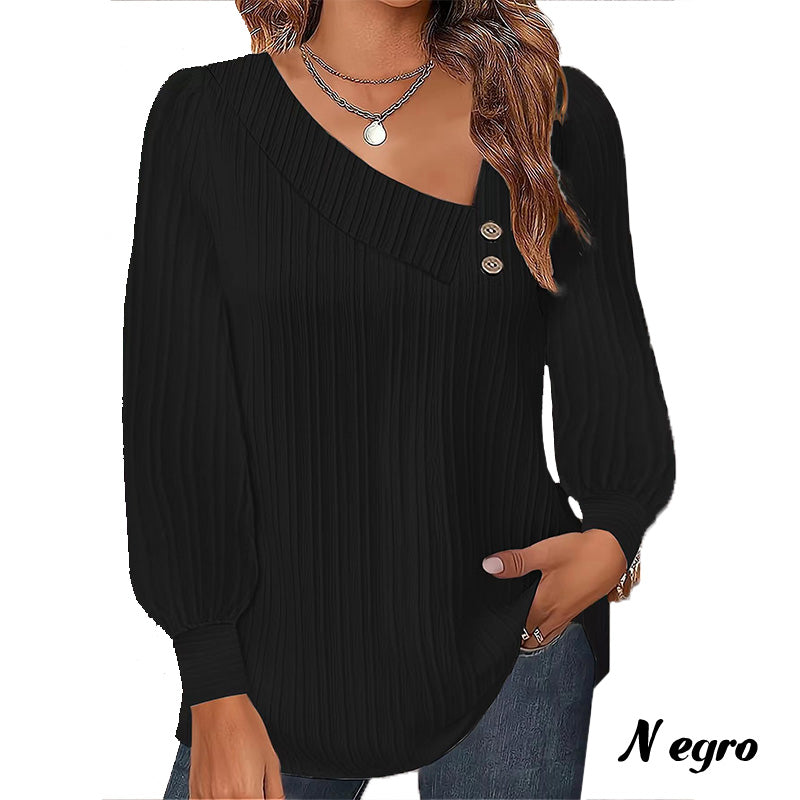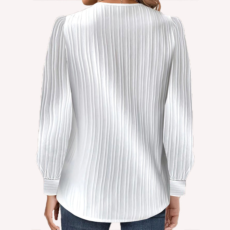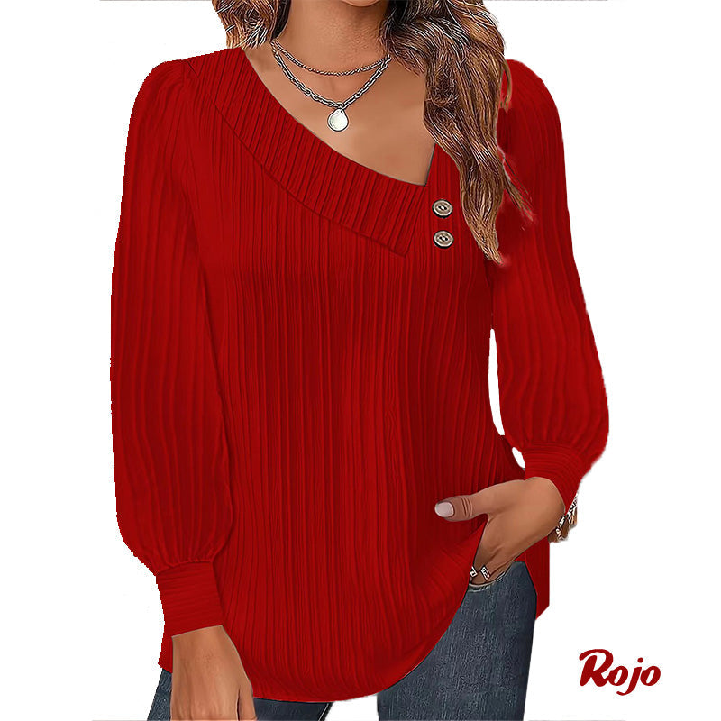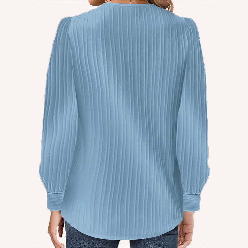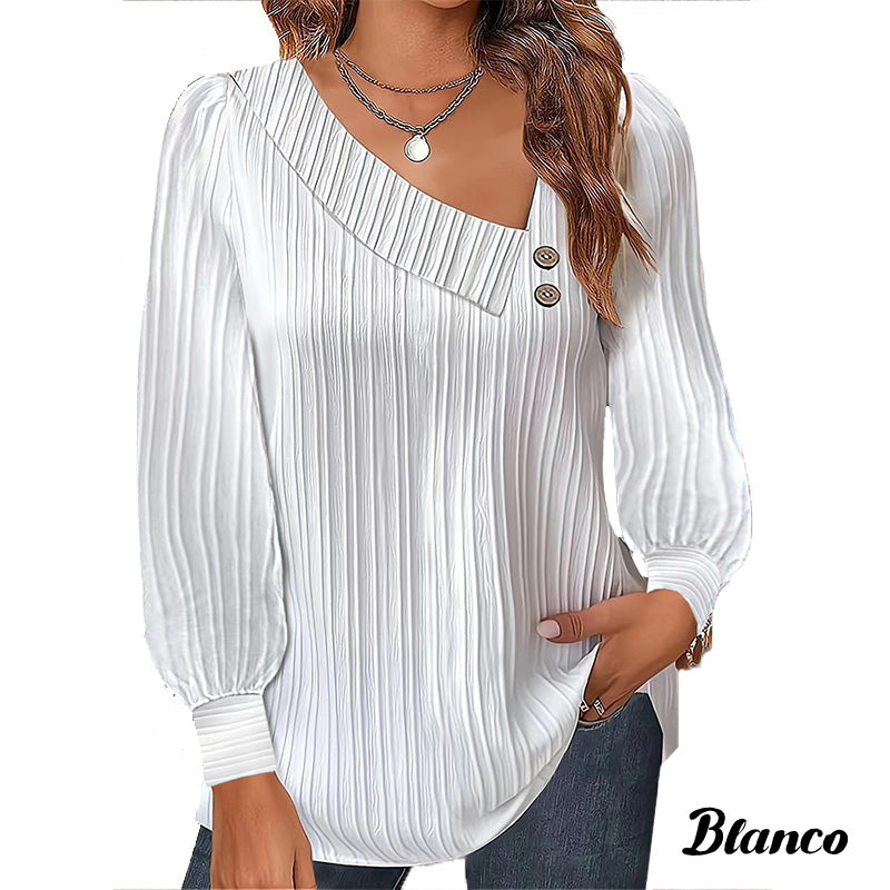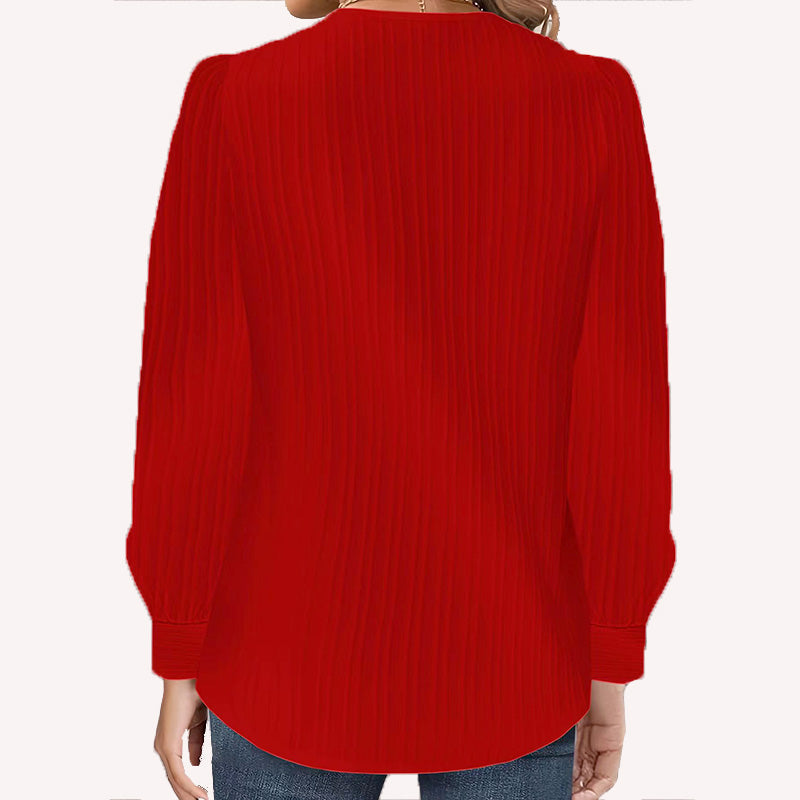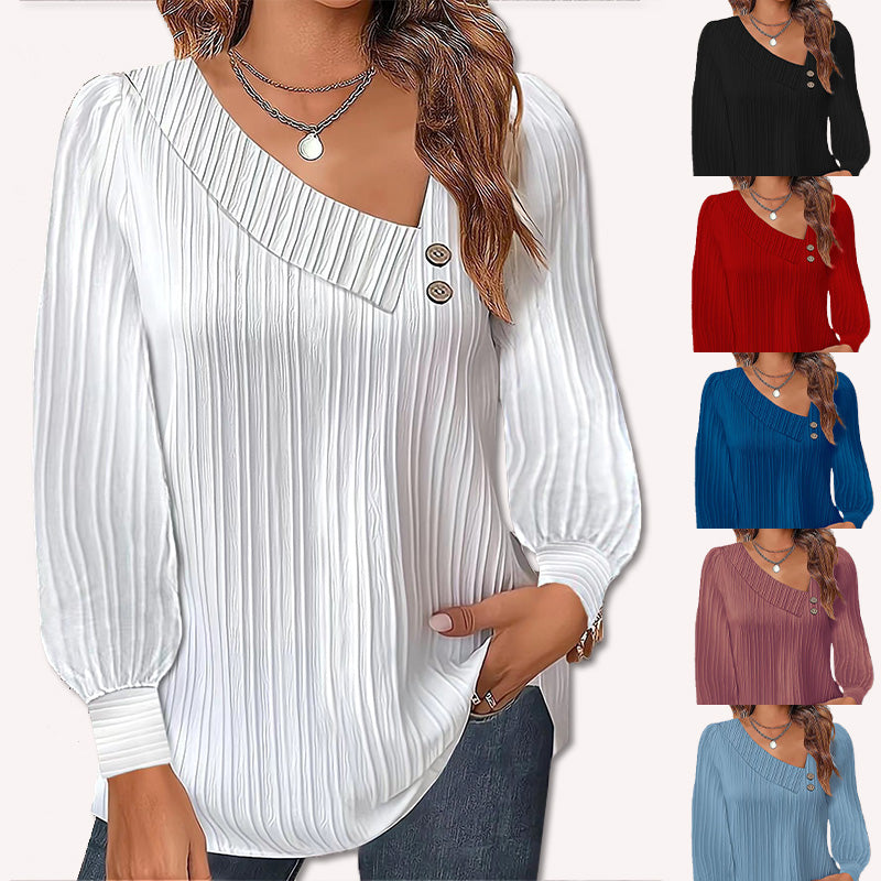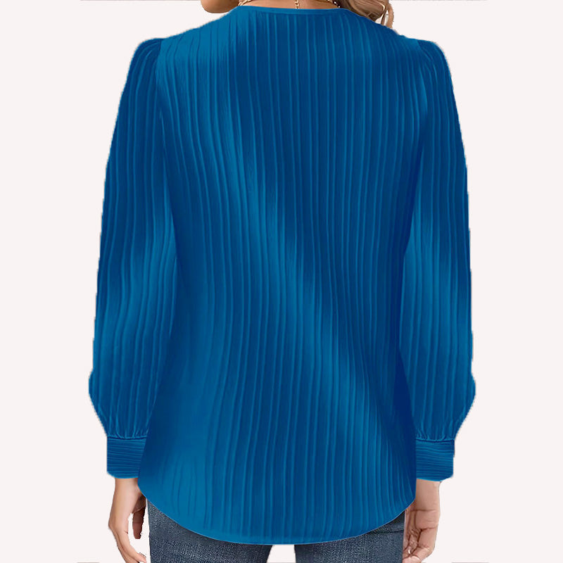 Gi garderoben hennes et løft med vår ensfargede, langermede dametopp med skrå utringning og plisseringer. Denne allsidige og stilige toppen er designet for å gi hverdagsantrekket ditt et sofistikert preg. Enten det er til kontoret, en uformell utflukt eller en spesiell anledning, kombinerer denne toppen komfort og eleganse for en tidløs look.