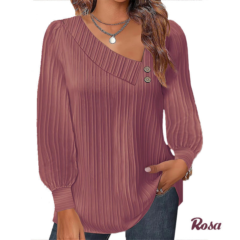 1 * Ensfarget, langermet dametopp med skrå halsutringning og plisseringer