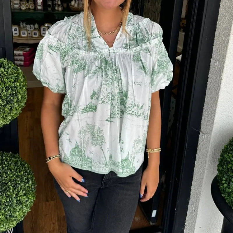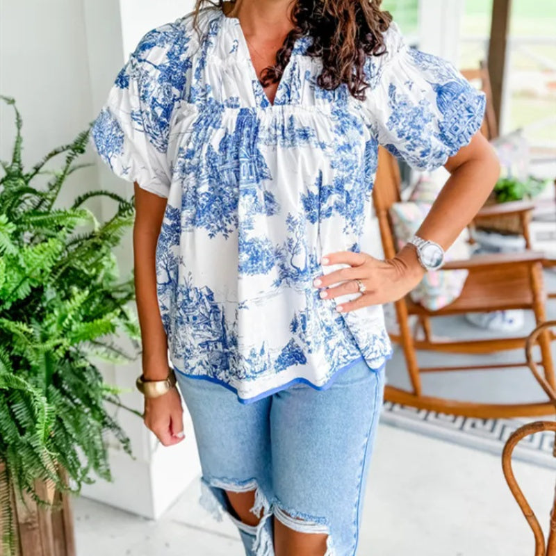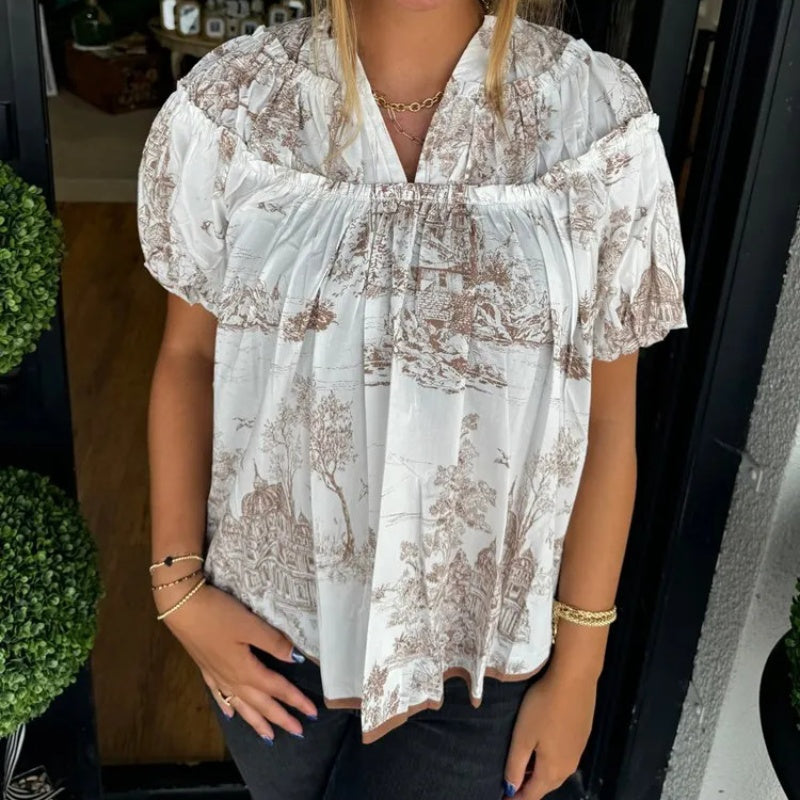 PUSTENDE OG LETT STOFF: Denne blusen er laget av mykt, pustende stoff og er perfekt for varmt vær, og gir komfort og luftighet hele dagen.