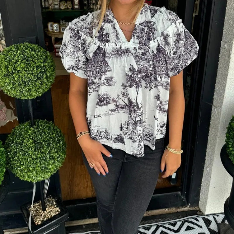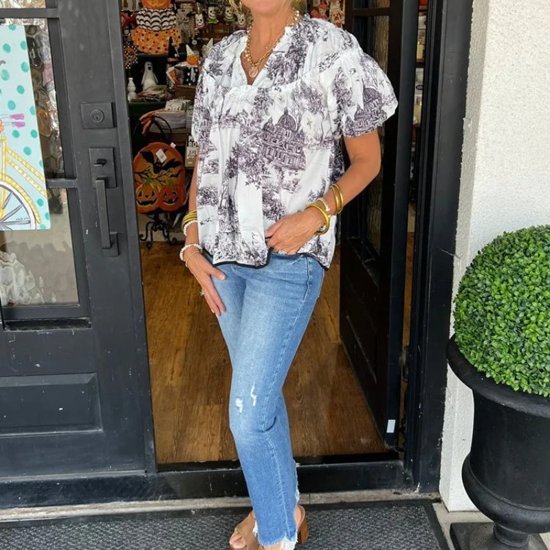 UNIKT MØNSTER: Blusen har et kunstnerisk preg og er perfekt å kombinere med ulike underdeler som shorts, skjørt eller jeans for et stilig antrekk.