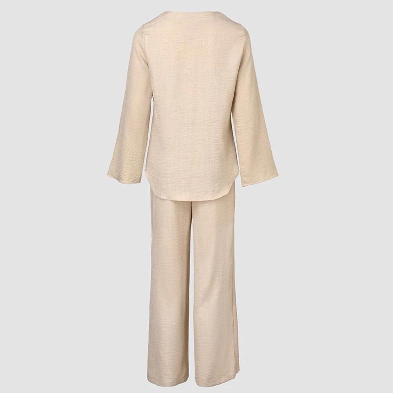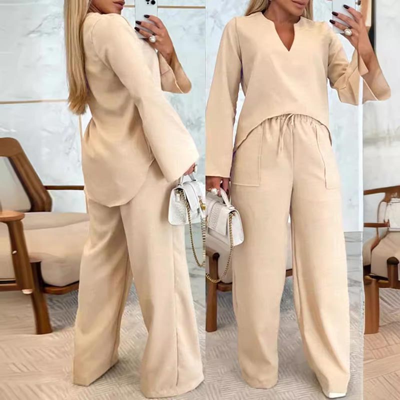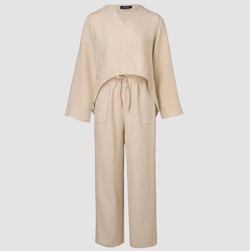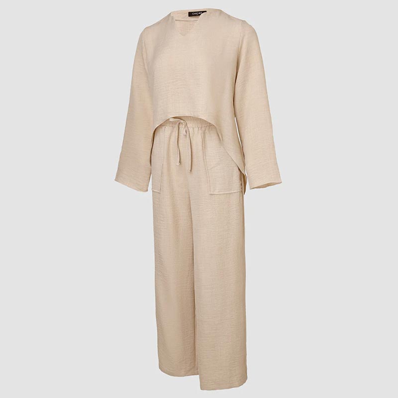 Dette stilige og komfortable todelte ensemblet kombinerer en unik asymmetrisk genser med en avslappet bukse med snøring i livet, noe som skaper en look som er både uanstrengt og trendy.