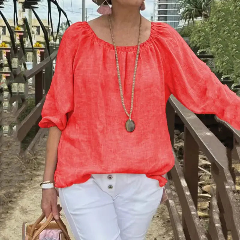 STILIG RULLEHALSBLÅS: Utsmykket med en delikat rysjedetalj langs halsen, noe som tilfører et snev av feminin eleganse og løfter hele designet.
