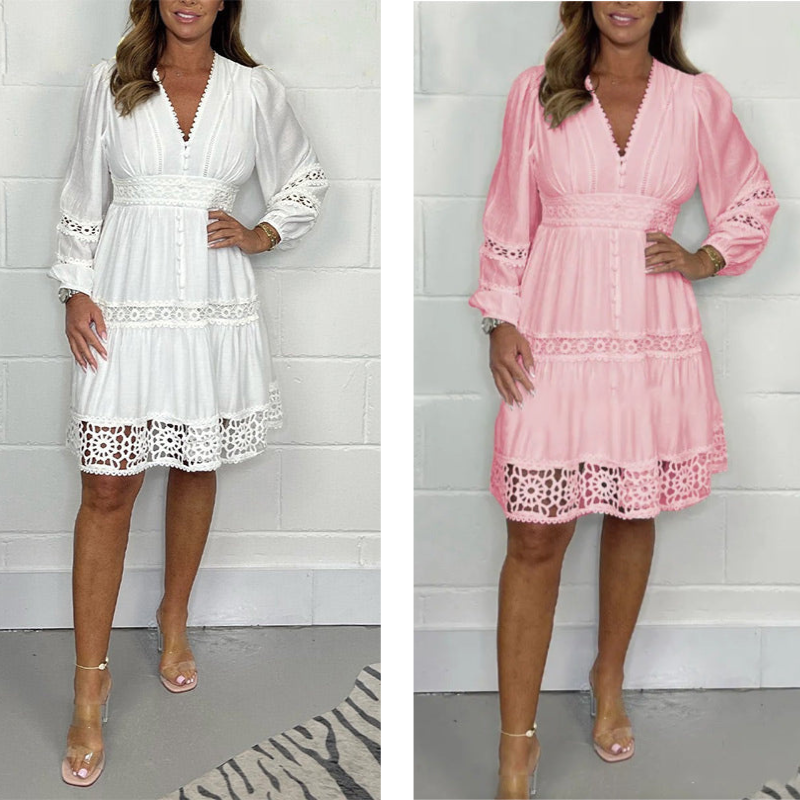 Ta steget inn i tidløs eleganse med vår Hvit vintage-kjole med utringet blonder og V-utringning for kvinner. Denne fantastiske kjolen har intrikate blondedetaljer, en smigrende V-utringning og et vintageinspirert design. Enten du skal på en spesiell anledning eller bare ønsker å utstråle feminin sjarm, vil denne kjolen garantert gjøre inntrykk.